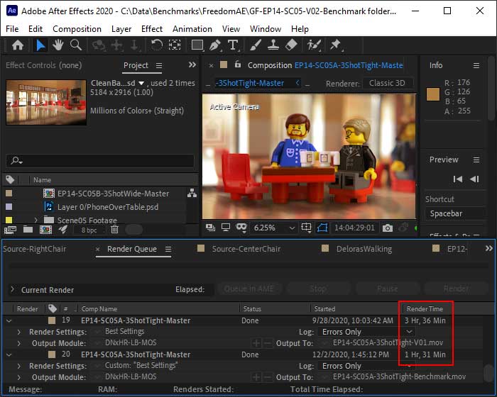 I also did some After Effects render tests, in which this ThinkStation rendered out 5K composites for my Grounds of Freedom animation series more than twice as fast as my previous system. This equates to about 3 hours of time saved per episode. What’s more, Adobe showed off some multi-frame rendering tools in AE at MAX last year, and I am confident that once they are implemented in the shipping program, this 64-core system will really stand apart from the competition.