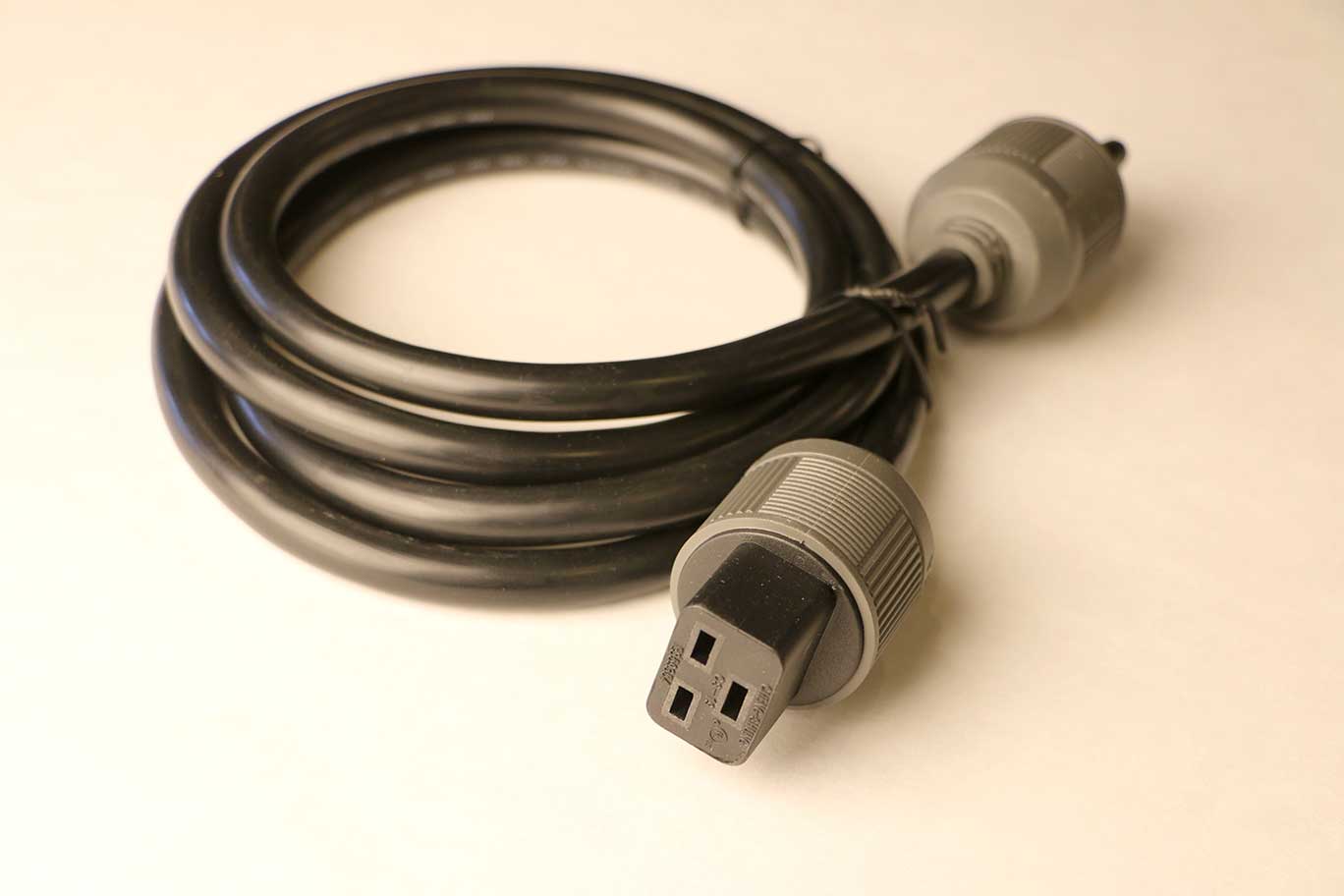 Right above all of this is the 1600W power supply, which has a different connector than most users will be familiar with, a C19 connector instead of the usual C14, due to the potential for the system to draw more than 15 amps from a 120V circuit. Without having 4 GPUs, there is no way my system will ever draw that much current, so I was grateful that the supplied power cable still fit into a regular 15Amp plug on my UPS.