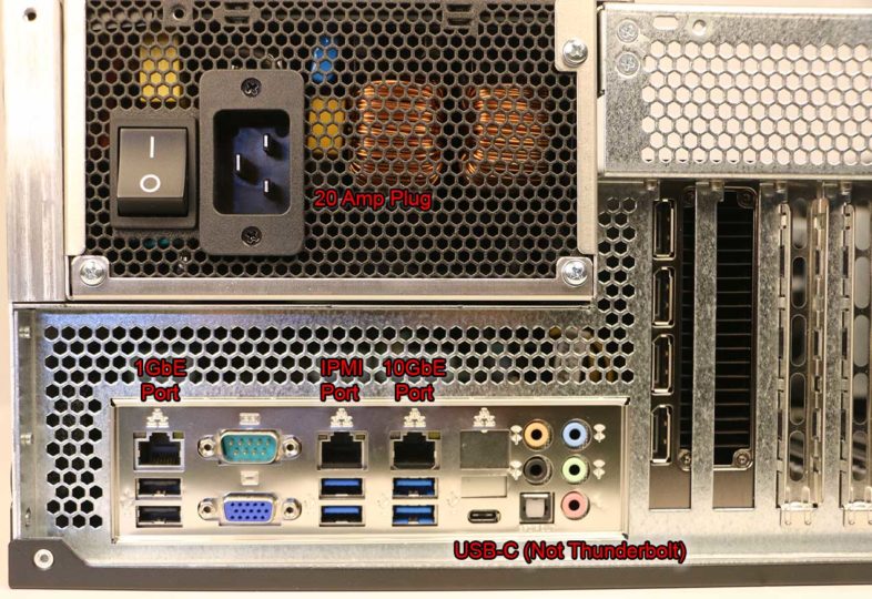 The back side looks different than most systems, in that the motherboard is mounted on the opposite side of the case from conventional systems, placing the I/O bracket at the bottom, and the PCIe slots above that. The I/O bracket includes six USB-A ports, (four of them blue 3.0 ones) and one USB-C port (USB3.2 Gen2x2) that is not Thunderbolt compatible. (And there apparently is no option for adding support for Thunderbolt to this system, which is surprising for an Intel system.) There is an optical port and five 1/8″ audio jacks for 5.1 audio as well as microphone and line input. There is a legacy serial port, a VGA port, and three RJ-45 network jacks. The center network jack, and the VGA port are for the IPMI baseband management controller, which I will discuss later. The far jack at the bottom corner is an Intel i210AT 1GbE controller, while the one closer to the PCIe slots is an Aquantia AQC113 10GbE controller with support for N-BaseT. None of these network jacks is labeled or color coded, which is an issue I have with other SuperMicro motherboards as well.