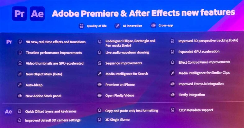 On the video front, the new AI object video masking tools in Premiere Pro allow you to integrate pieces of existing video shots into AI content, or even just into other video shots.  And the Intelligent Media search uses AI to search for content in an existing video library, or a batch of fresh footage.  There is also a new auto-bleep feature for censoring certain words in both audio and text transcripts.