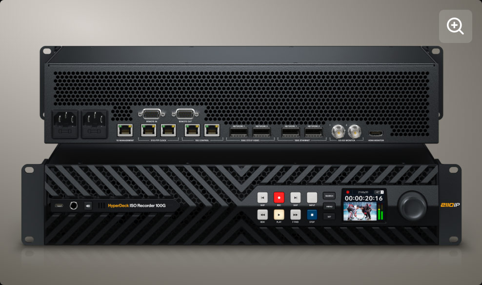 All of those potential sources of 100GbE 2110 feeds can be sent to ATEM Constellation IP switchers for processing, or to Hyperdeck ISO Recorder 100Gs, which can record 8 streams of UHD, (or presumably 2 streams of 8K if you treat them as quadrants). They record to network storage devices, also over separate 100GbE connections, of which Blackmagic released two options. The Cloud Store Ultra runs on 12 internal M.2 NVMe drives, while the Media Dock Ultra uses up to 3 URSA Cine Media Modules to record to or from over its dual 100GbE connections. These devices can all be linked with a new 8-port 100GbE 820 ethernet switch.